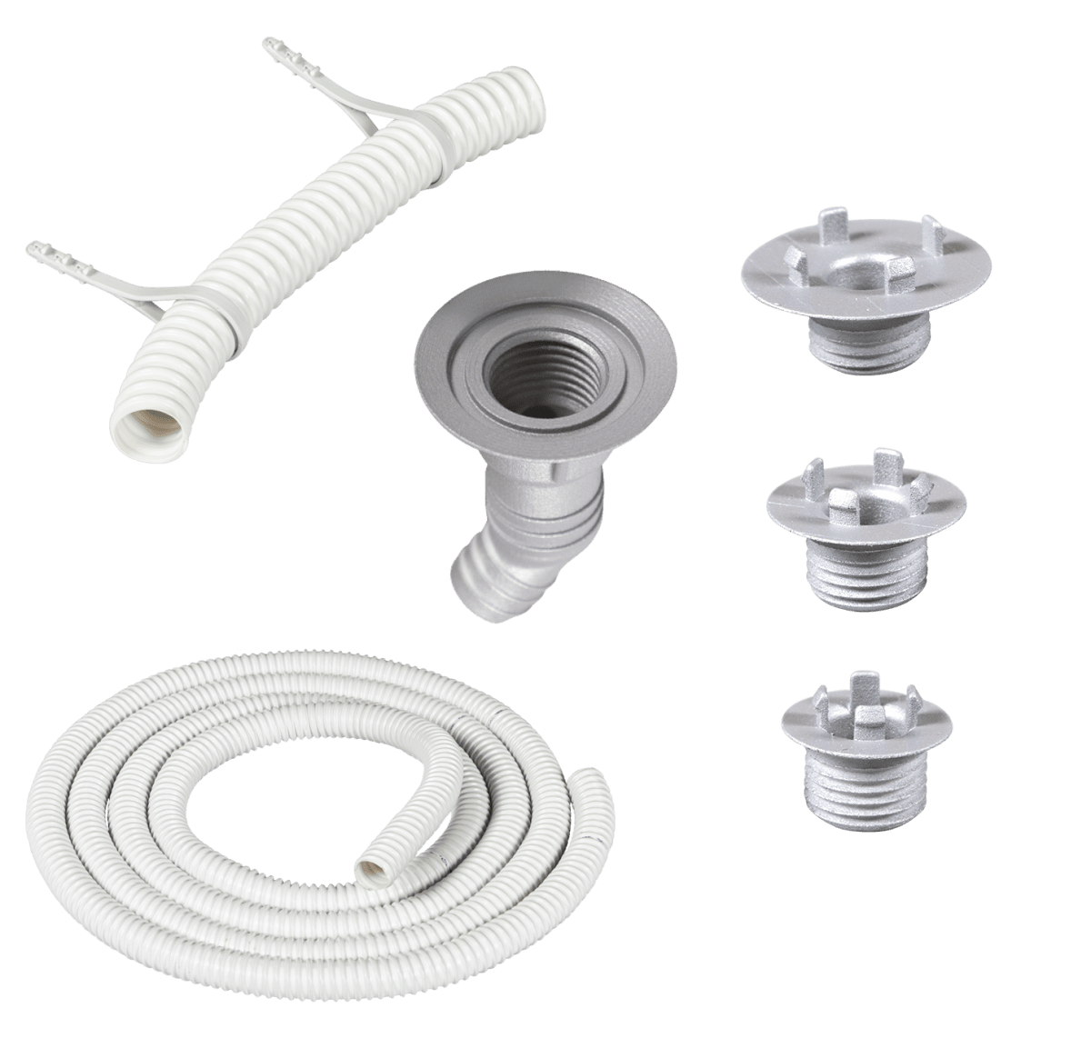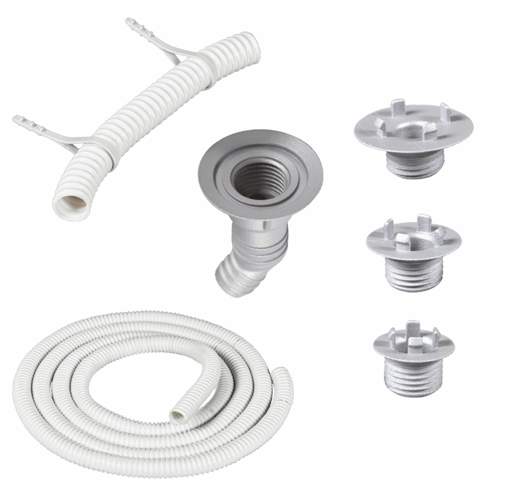 Satsen passar utlopp i tre olika storlekar: Ø32, Ø38 och Ø42mm. Du får dessutom en vit UV-stabil kondensslang, galvaniserad slangklämma och väggfästen för en stabil montering. Tack vare den genomtänkta konstruktionen blir installationen enkel, samtidigt som resultatet blir långvarigt.