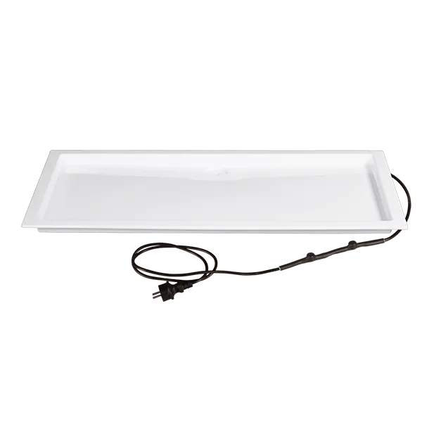 Tänk på att leda bort vattnet som tråget samlar upp. När du använder ClimaLines avledningssatser blir det enkelt att skapa en komplett lösning. Kombinera bara en isolerad slang med en termostatstyrd lågeffekts värmekabel på 15 W/m, så får du en avrinning som förblir frostfri även under vinterns kallaste dagar.